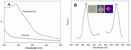 UV-Vis spectra (A) and fluorescence spectra (B) of AuNCs/PDA film (Ex: excitation, Em: Emission). Inset: images of the PDA film (left), the PDA/AuNCs film (middle) under visible light, and the AuNCs/PDA film under UV light (365 nm) (right).