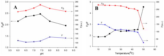 Fluorescence may be influenced by pH and temperature. Hence, their effect on the fluorescence response of the film to bilirubin was investigated by adjusting the temperature and pH value of PBS solution (50 mM) (Figure 4). Figure 4A illustrates the value of F0, F, and F0/F (where F0 and F are the fluorescence intensities for the sensing film in the absence and presence of 50 μM bilirubin, respectively) of the film at different pH values. The change in pH value exerted a moderate influence on F0 and F. The relatively low fluorescence quenching F0/F of the film in pH < 7.4 media might be ascribed to the decrease in bilirubin solubility at a lower pH value. However, higher pH values could destroy the formation of the bilirubin–BSA complex to reduce fluorescence quenching. Physiological pH (7.4) was suitable for bilirubin detection. The effect of temperature on bilirubin sensing is shown in Figure 4B. A higher quenching efficiency was achieved beyond physiological temperature, while the BSA-AuNCs exhibited a drop in emission intensity upon raising the temperature. Hence, bilirubin determination could be carried out at 25 °C.