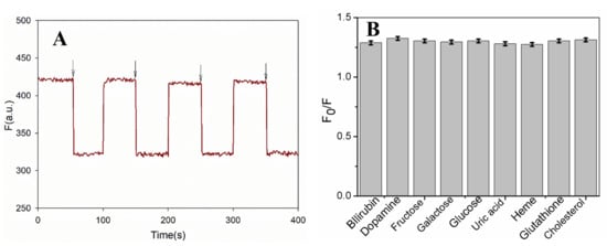 Reusability is an important parameter for sensors. After interacting with bilirubin, the fluorescence of the PDA/AuNCs film could be regenerated by 0.1 M NaOH and then washing with pure water. The film sensor was interacted repeatedly with 10 μM of bilirubin and 0.1 M of NaOH to determine the reusability. The quenching efficiencies (F0/F) were measured and are shown in Figure 6A. There is no significant change in the fluorescence response of the film towards bilirubin in each sensing/regeneration cycle, indicating that the sensor has acceptable reusability.