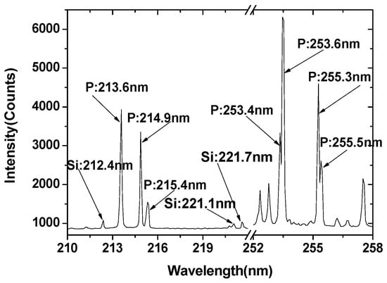 The LIBS spectrum of the compound fertilizer pellet (No.1 sample) in the ranges of 210–220 and 250–260 nm is shown in Figure 2, which includes the emission lines of silicon (Si) and P. Compound fertilizer production enterprises generally use phosphate ore as raw material. Thus, Si is one of the main ingredients of compound fertilizers, and the characteristic lines of Si are 212.4 nm, 221.1 nm, and 221.7 nm according to the National Institute of Standards and Technology (NIST) database. It can be seen from Figure 2 that the compound fertilizer sample contains abundant characteristic lines of P element. The feature spectral lines of P element detected by LIBS were 213.6 nm, 214.9 nm, 215.4 nm, 253.4 nm, 253.6 nm, 255.3 nm, and 255.5 nm. The characteristic lines of 253.4 nm and 253.6 nm are interfered by the characteristic line of Fe element in the compound fertilizer. The adjacent peaks of the two characteristic lines of 255.3 nm and 255.5 nm can be clearly distinguished, and Lorentz double peak fitting is needed when fitting the line intensity. The characteristic lines of 213.6 nm, 214.9 nm and 215.4 nm are not disrupted by other elements.