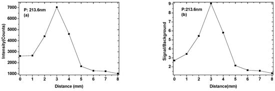 The line intensity of P 213.6 nm (a) and signal to background ratio (b) as a function of detection distance.