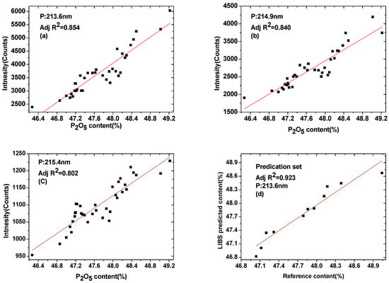 Calibration curves of P spectral line: (a) P: 213.6 nm, (b) P: 214.9 nm, (c) P: 215.4 nm, and (d) the relation of LIBS predicted value and reference value for the prediction set.