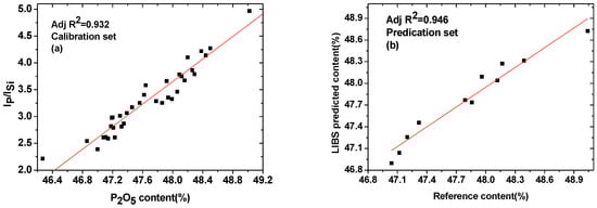 Because of the complex fertilizer matrix, the analysis focusing only on one line intensity of an element might result in the loss of valid information, which cannot meet the requirements of the quantitative analysis of LIBS. PLSR is one of the multivariate analytical techniques, which can make full use of the spectral information, reduce the matrix effect and improve the accuracy of quantitative analysis. Sample sets were the same as those of the above univariate model and internal standard model. Calibration set was used to construct a model correlating the LIBS signal and the concentration of P; this correlation can later be used to predict concentrations of prediction set. In order to improve the processing speed and avoid overfitting of the model, a proper spectral range was selected for modeling analysis. A reduced spectral range from the full spectrum, which included most of the strong lines of P, was taken into account for PLSR model. The reduced wavelength ranges from 210 to 260 nm for P was used to obtain calibration model. The MATLAB software was used for PLSR. Seven principal components are used to construct the PLSR model. Figure 6a–b shows the calibration and prediction results of PLSR model for P, respectively.