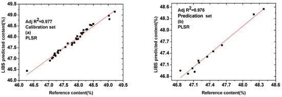 Comparison between LIBS predicted value (PLSR model) and reference value presented in (a) thirty-six calibration samples and (b) eleven prediction samples.