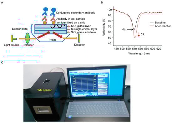 Optical arrangement of a WM sensor device was based on the Kretschmann configuration as reported previously [7,8,10,11]. Briefly, when polarized light enters through a prism at a particular angle of incidence, light of a specific wavelength is propagated in a slab waveguide of a sensing chip, a phenomenon known as excitation of the WM, which causes decrease in the reflectance of light. When target molecules are captured on a sensing chip, the interaction influences the reflective property of the waveguide surface and the complex refractive index near the waveguide surface can be evaluated as a change in the depth and/or wavelength of the dip in reflectance spectra (Figure 1A). While the interaction of colorless target molecules on a chip preferentially induces a shift of the wavelength of the dip peak, the presence of colored target molecules induces a change in the dip depth (ΔR) [4,16] (Figure 1B). When the wavelength of WM overlaps that of conjugated materials or dye, a change in the depth of the dip in reflectance spectra becomes larger [4,11]. A prism was made of SiO2 glass, the bottom angle of the prism was 38°. A sensor chip was composed of a SiO2 glass substrate, an embedded silicon layer and an upper SiO2 layer. The thicknesses of the embedded silicon and upper SiO2 layers was adjusted for resonance wavelength of 530 nm [9]. We examined several fluorescent dyes and gold nanoparticles for signal enhancement in preliminary experiments, and selected HiLyte Fluor 555 (absorbance wavelength: 555 nm) and 80 nm gold nanoparticles (absorbance wavelength: 553 nm). Horseradish peroxidase (HRP) catalyzes the conversion of 3-amino-9-ethylcarbazole (AEC) to red water-insoluble precipitates, which induce a larger change in the dip depth [10]. All measurements were performed at room temperature with a WM sensor device EVA-001 (Optex, Otsu, Japan) (Figure 1C).