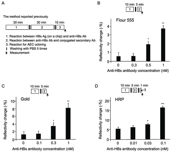 Comparison of signal enhancement methods in detection of anti-HBs antibody with a WM sensor. (A) Experimental procedure of the previous method using a peroxidase reaction [10]. Ag, antigen. Ab, antibody. (B) Signal enhancement using secondary antibody conjugated with the fluorescent dye (Fluor 555). (C) Signal enhancement using gold nanoparticle-conjugated secondary antibody. (D) Time shortened method using HRP-conjugated secondary antibody. * p < 0.05, ** p < 0.01, *** p < 0.001 versus control sample without anti-HBs antibody (n = 3 for each group).