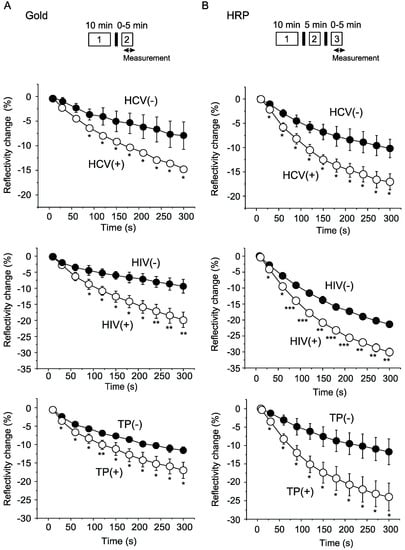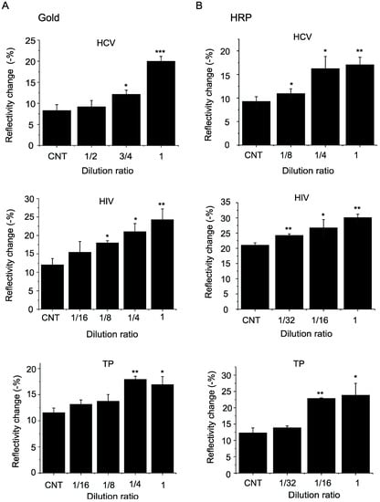 Comparison of detection sensitivity of signal enhancement using gold nanoparticles (A) and a peroxidase reaction (B). Changes in a dip of a spectrum were measured at the time point of 300 s (5 min) as shown in Figure 2. CNT, control plasma. Plasma positive for antibody against HCV, HIV or TP were diluted in indicated ratios. * p < 0.05, ** p < 0.01, *** p < 0.001 versus control plasma (n = 3 for each group).