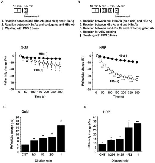 Detection of HBs antigen with a WM sensor. (A) Signal enhancement using gold nanoparticle-conjugated antibody. (B) Signal enhancement using HRP-conjugated antibody. Comparison of detection sensitivity of signal enhancement using gold nanoparticles (C) and a peroxidase reaction (D). Changes in a dip of a spectrum were measured at the time point of 5 min (300 s). CNT, control plasma. Plasma positive for HBs antigen were diluted in indicated ratios. * p < 0.05, ** p < 0.01, *** p < 0.001 versus control plasma (n = 3–4 for each group).