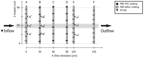 FBG fibers in the sediment were attached to a frame of polyvinyl chloride (PVC) tubes to ensure the placement of the sensor strings with respect to each other (Figure 2). The FBG interrogator used for the experiment was capable of simultaneously interrogating 8 sensors. For this reason, all FBG fibers had 8 FBG sensors each, with Bragg wavelengths of 1518 nm, 1527 nm, 1536 nm, 1545 nm, 1554 nm, 1563 nm, 1572 nm, and 1581 nm. The FBG sensors were inscribed in a standard single-mode Corning SMF28 fiber with an acrylate coating using an ultraviolet femtosecond laser (Loptek GmbH & Co., KG, Berlin, Germany). Two types of FBG fibers were used in the AS: 3 fibers (B, C, and D) had a sensor spacing of 15 cm and a PVC buffer of 3 mm in diameter, and 3 fibers (A, E, and F) had a 10-cm spacing of the sensors and a 1-mm-thick teflon tube of 3 mm diameter in the sensor section. Nine resistive platinum PT100 temperature sensors were placed in the AS as an additional temperature reference plus one PT100 sensor in the inflow reservoir (FS400P, Conrad). The data from the PT100 sensors was acquired by an Ecograph RSG30 (Endress + Hauser, Reinach, Switzerland).