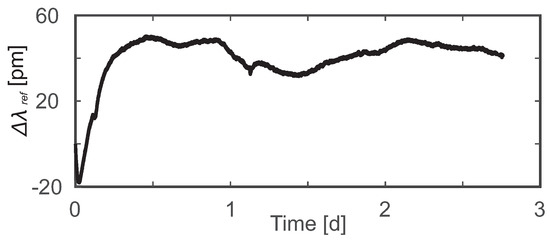 The groundwater temperature was very stable and rarely fluctuated 0.1 C in an hour; thus, a long-term stability of the interrogator light source was required for the heat-tracing experiments. According to the published interrogator specifications, the wavelength stability was 5 pm in a steady-state environment [44]. However, a measurement with the FBG fibers in a stable laboratory environment showed a wavelength variation up to 20 pm, which translated to a drift of 2 C. The measured drift did not originate in the fiber but was rather due to the thermal instabilities affecting the interrogator photonic integrated circuits. At the time of this study, the interrogator had no built-in wavelength referencing system so the manufacturer provided an additional external reference. This external reference was an FBG sensor with a Bragg wavelength of 1550 nm surrounded by thermoelectric elements controlled by a thermoelectric cooling (TEC) controller (ITC4005, Thorlabs, Newton, MA, USA). With this FBG reference sensor embedded, immobilized, and temperature-stabilized, the reflected wavelength could be used to quantify the drift of the system at 1550 nm directly (see Figure 4). The drift was approximately 70 pm during the initial 12-h operational period and, afterwards, fluctuated in the range of 20 pm. Thus, the interrogator could be used for the heat-tracing experiments only in combination with the external reference sensor since a drift correction needed to be performed.
