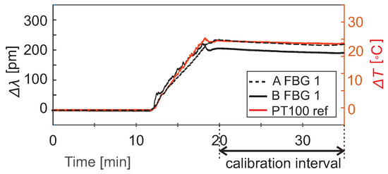The values for each coating in Table 1 are an average of 8 FBG sensors within each fiber from a 15-min calibration interval when the water temperature was held stable (Figure 5). The accuracy of the PT100 calibration sensor determined the confidence bounds of the values. In the interval of 20–45 C, the accuracy of the differential temperature measurement with the reference sensor was ±0.8 C. The temperature sensitivity of the FBG sensors, i.e., the wavelength shift per 1 C, could be calculated from Equation (7). The values for a 1550-nm FBG sensor are presented in Table 1. The temperature resolution of the FBG sensors depends on the resolution of the spectrum analyzer in the interrogator, in this case, 1 pm, and is calculated from the sensitivity S as .