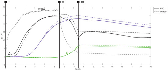 A comparison of the FBG data translated into temperatures with the PT100 temperature profiles: The displayed data are from the sensors highlighted in Figure 3. Identical colors indicate sensors in the same row on the frame (the same distance from the inflow system). Experimental stages: I—hot inflow, II—cold inflow, and III—no inflow.