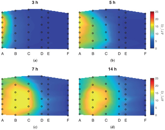 The time evolution of the thermal plume in the AS at four different moments: (a) t = 3 h; (b) t = 5 h; (c) t = 7 h; (d) t = 14 h from the start of the experiment. The black circles indicate the calculated temperature from the FBG sensors. The displayed temperature map was generated by a linear interpolation from the FBG data.