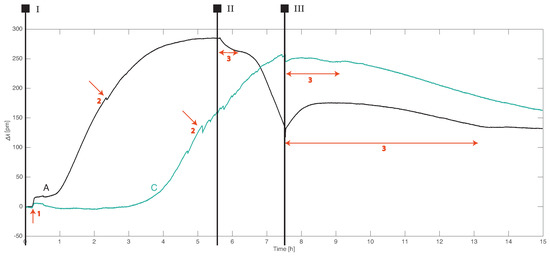 The step strain response at t = 0.2 h (arrow 1) is common for the FBG sensors from rows A and C. It is the result of physical adjustments made to the inflow system. The connection between the inflow reservoir and the inflow tubes is made of several plastic hoses. At the start of the experiment, these connections were checked and tightened. Such manipulations could result in either a physical strain due to the small movements of parts in the AS or changes in the hydraulic conveyance efficiency of the system.