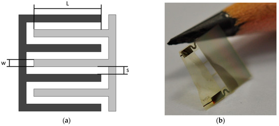 The used sensor consists of an interdigital structure on a flexible substrate. A schematic of the sensor is shown in Figure 1a. The geometrical parameters of the used sensors are shown in Table 1, where N is the number of fingers. The electrodes are fabricated on a 5 µm thick polyimide (PI) foil. To further reduce the influence of the sensor on the structural properties of the CFRP, holes are created in the substrate. This results in a net-shaped substrate with net structure dimensions in the range of the diameter of the fiber [21]. The sensor is fabricated in the cleanroom using microfabrication techniques. In the first step, a polyimide (PI) precursor (UPIA–ST from UBE) is spin coated on a silicon wafer, which only acts as a handling device here. The polyimide is cured on a vacuum hotplate with a temperature profile specified by the manufacturer. It results in a 5 µm thick PI layer. On this PI layer, a 300 nm gold layer is sputtered and wet chemically structured in a photolithographic process. On top of the electrodes, a second PI layer is created to have electrical isolation. This top isolation layer has a thickness of around 500 nm. The sensors are lifted from the wafer and wired. For the wiring, copper wires of 127 µm diameter with PI coating are used. The connection of the wires and sensors is realized with conductive silver glue. The contacted area is isolated afterwards. In Figure 1b a photograph of the sensor is shown.