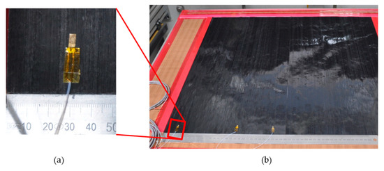 (a) Sensor during the integration in carbon fiber composite. (b)Carbon fiber prepreg plate with sensors during fabrication.