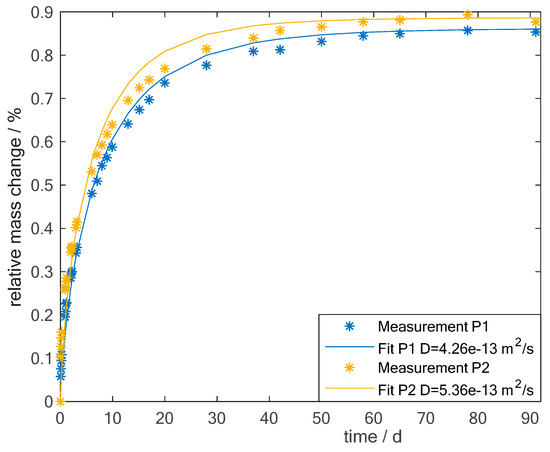 To calculate the diffusion coefficient from the weight measurements, a fit of this approximate solution to the measured values can be done.