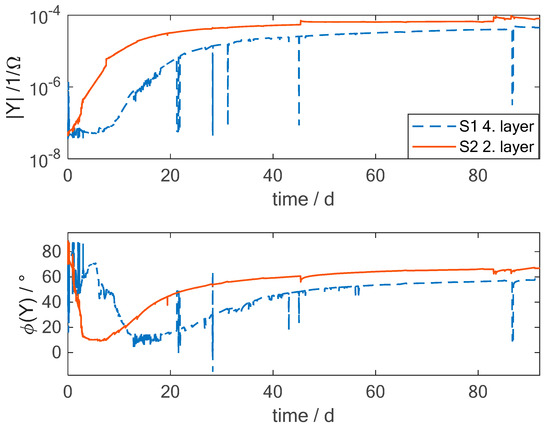 Admittance changes of two interdigital sensors integrated into the CFRP at a different position during exposure to a hot-wet environment of 70 °C and 85 % relative humidity. Here the measurement at a frequency of 31.6 Hz is shown. Sensor S1 is placed in the middle of the plate and S2 at ¼ of the plate.