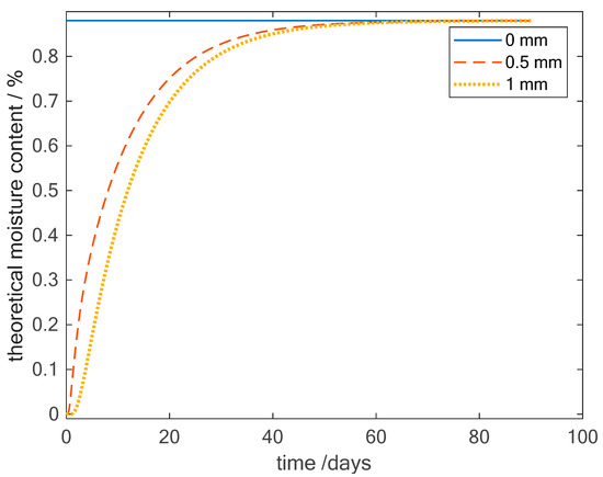 where is the initial concentration inside the plate, is the maximum saturation concentration, is the thickness of the plate and the diffusion coefficient. This equation describes the moisture concentration at every place at every time inside the plate. To compare the theoretical value to the measured mass changes, Equation (3) is integrated over time