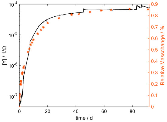 In the next step, the amplitude of the admittance of sensor S2 is directly compared to the mass change measured. In Figure 8 the amplitude of the admittance is shown in black and the measured mass change values in red stars. It can be observed that the admittance curve seems to fit the mass change quite well. Therefore, the sensors can be used to determine the actual moisture uptake in the CFRP part locally when the saturation moisture uptake and the diffusion coefficient are known.