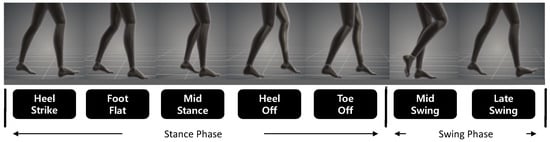 A gait cycle [29] is the period from when a foot touches the ground to when it falls from the ground and reaches the ground again. As shown in Figure 2, the gait cycle consists of seven stages (‘heel strike’, ‘foot flat’, ‘mid stance’, ‘heel off’, ‘toe off’, ‘mid swing’, and ‘late swing’). The ‘heel strike’ stage represents the beginning of the gait cycle, where the heel of the first moving foot touches the ground, while the sole of the moving foot touches the ground at the ‘foot flat’ stage. In the ‘mid stance’ stage, the leg of the first moving foot is perpendicular to the ground and momentarily stopped, while the other leg moves forward. The ‘heel off’ stage refers to the time when the heel begins to move away from the ground, and the ‘toe off’ is the step where the anterior toe of the first moving foot leaves the ground while the sole of the other foot touches the ground. The ‘mid swing’ is the step forward with the foot off the ground. Finally, the ‘late swing’ refers to the stage immediately before the next gait cycle begins. When viewed from one foot, ‘heel strike’, ‘foot flat’, ‘mid stance’, ‘heel off’, and ‘toe off’ stages are defined as the ‘stance phase where the foot touches the ground. The ‘mid swing’ and ‘late swing’ stages that are separated from the ground, are defined as the ‘swing phase’.