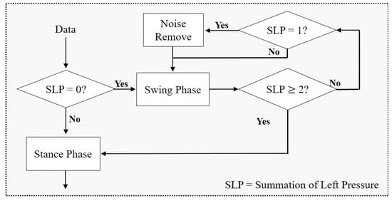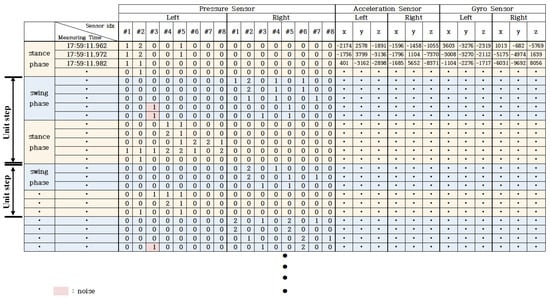 Figure 4 shows the process of removing noise in the swing phase. First, the starting point of the ’swing phase’ is defined as the point at which the sum of all eight sensor values of the left foot pressure sensor array becomes zero [30]. The starting point of the stance phase following the swing phase is defined as the point at which a non-zero value is measured by two or more of the eight pressure sensors. In the case that the sum of the sensor arrays between the starting point of the swing phase and the starting point of the stance phase is not 0 but 1, the pressure sensor value at that point is determined as noise. Thus, the sensor value is changed to 0.
