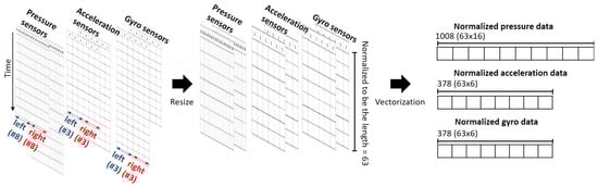 To extract features that are less sensitive to environments when measuring data, all unit steps were resized based on the time (t) of the shortest unit step (in this paper, t = 63) so that lengths for all steps were normalized [26]. As a result, measurements for normalized unit steps of the pressure sensor array, the acceleration sensor array, and the gyro sensor array were converted into arrays of 63 × 16, 63 × 6, and 63 × 6, respectively, and then stored as vectors (x) of 1008 × 1, 378 × 1, 378 × 1, respectively, using a lexicographic ordering operator. Figure 5 shows raw data as well as normalized data for the unit step.