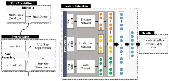 Meanwhile, as sensor modules have become smaller and low-power sensor technologies have been developed, various wearable devices such as smart watches, sports bands, and smart insoles have been developed. Since the use of wearable sensors has less environmental limitations for data collection, it is relatively easy to collect data in everyday life. This has advantages of reduced data storage and processing burden because it is smaller in capacity compared to the use of video data such as optical flow and heat map. Among gait analysis methods using smart insole, the method in [24] can classify gait types of elderly people using pressure, acceleration, and gyro data of smart insoles by applying a decision tree based on various conditions. However, this method has a problem of incorrectly classifying some types of gait because it classifies based on conditions set by the experimenter. In [25], pressure sensor data for walking are classified by kernel based principal component analysis (KPCA) and support vector machine (SVM) based on walking pattern. However, this method reflects variations that are not helpful for walking classification when projecting data on axes orthogonal to each other while preserving the maximum variance of data. Thus, it is unsuitable for classifying data having various classes or variations in gait pattern. In [26], seven types of gait were classified using discriminant analysis [27] with pressure data of a smart insole [26]. However, it is necessary to measure multiple steps in order to obtain reliable classification performance. In addition, it could not reflect various characteristics of gait because it only uses one pressure sensor.
