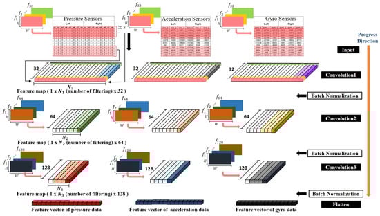 In general, a convolution-based artificial neural network consists of a feature extractor and a fully connected network. The feature extractor contains three types of layers: filter layer, nonlinear activation function layer, and feature pooling layer [22]. Figure 6 shows the overall structure of the proposed gait type classification method. As shown in Figure 6, a network is constructed for each of the pressure sensor array, the acceleration sensor array, and the gyro sensor array data. It was learned independently in order to extract feature maps for individual sensor arrays.