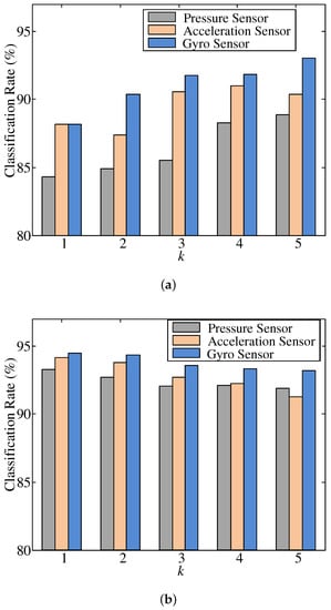 Figure 9a shows results of using 1000 training samples and 1000 test samples for all k. As seen in Figure 9a, when the number of steps included in gait data sample increased, the classification rate increased. However, starting from three steps or more, the increase in the classification rate was either small (for the pressure sensor and gyro sensor) or otherwise decreased (for the acceleration sensor). This means that we can extract more quality features for gait classification by constructing data samples with more steps and using those samples in feature extraction. However, if more than a certain number of steps are gathered, it appears that additional useful information is not actually obtained or that unnecessary information gathered can hinder effective feature extraction.