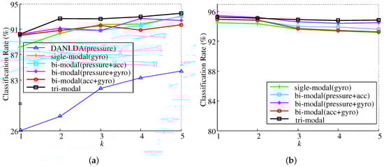Figure 10 shows experimental results of the single-modal DCNN and various multi-modal DCNNs. In Figure 10, ‘bi-modal’ means the result of using two kinds of sensor arrays together, and ‘tri-modal’ means that three kinds of sensor arrays are used together. In order to clearly show the effectiveness of the proposed method, we compared it with DANLDA, the most current method [26] using a smart insole. Since the method of [26] uses only a pressure sensor, we first compared the single-modal DCNN (gyro) with DANLDA. In the 7-fold cross validation experiment, when k is 3 or less than 3, there is no null space because the number of training data samples is larger than the dimension of the data, and thus we show only the results of single-modal and various multi-modal DCNNs in Figure 10b. As shown in Figure 10a, the single-modal DCNN had higher classification performance, ranging from 8.49% (k = 5) up to 62.06% (k = 1) than DANLDA. In particular, while DANLDA can not effectively extract features for gait classification from gait samples with one step, the proposed DCNN can extract information about the type of gait even if only one step is measured. Consequently, classification rates are as high as 84.32% to 88.17% depending on the kind of sensor array being employed (Figure 9).