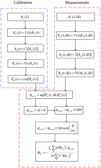 From Figure 2, the signal demodulation algorithm consists of two phases: calibration and measurement. In the calibration phase, the references are estimated and five steps are required: (a) the optical signal is acquired with the OSA spectrometer; (b) using the bank of K filters is filtered a wavelength channel, ; (c) the frequency spectrum is estimated through: