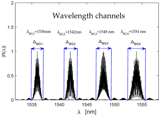 Applying the parameters presented in Section 6.1, the optical signal was computed. The normalized spectra can be observed in Figure 3. The composite reflection spectrum of a multi-point Fabry-Perot sensor is a superposition of reflection spectra of all local sensors. From Figure 3, the first wavelength channel has its bandwidth of , the second wavelength channel has its bandwidth of , the third wavelength channel has its bandwidth of and the fourth wavelength channel has its bandwidth of . Each wavelength channel has its own value and they have a very small variation between them. The working interval is : and .