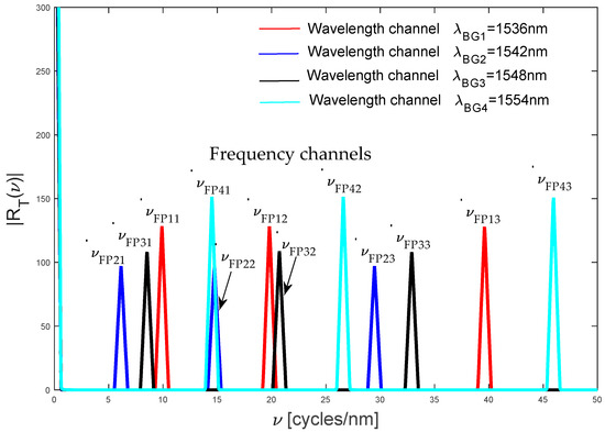 Figure 4 shows the positive components for our frequency spectrum . Analyzing Figure 4, the quasi-distributed fiber optic sensor has twelve Fabry-Pérot sensors and each local sensor produces one triangle function (frequency component, peaks). The red color corresponds to the frequency channels, . Three peaks have the same bandwidth and their central frequencies are , , and . The blue color corresponds to the frequency channels . Again, three peaks have the same bandwidth and their central frequencies are , and . The black color corresponds to the channels . Now, the bandwidth is and their central frequencies are , and . Finally, the cyan color corresponds to the channels . The bandwidth is and the central frequencies are , and , respectively. The bandwidths have small variations because each wavelength channel has its own Bragg wavelength, see Equation (12). Each interference pattern has its own frequency because each Fabry-Pérot sensor has its own cavity length and wavelength channel (see Equation (6)), see Table 1 and Figure 4.