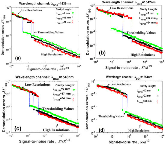 Applying the demodulation algorithm described in Section 5 and using the parameters presented in Section 6.1, the quasi-distributed fiber optic sensor (Figure 1) was numerically simulated. Our numerical results are shown in Figure 5. We present the behavior of demodulation errors vs. signal-to-noise rate . If demodulation errors are called the “resolution” as in our previous work [16,17], then all low-precision Fabry-Pérot sensors have two resolutions. Both resolutions are possible because the signal demodulation (Figure 2) is based on the FDPA algorithm and this algorithm evaluates the Bragg wavelength shift twice. Observing Figure 5, each Fabry-Pérot sensor has its own high resolution; however each wavelength channel produces one low resolution because this resolution does not depend on the cavity length. Additionally, the transition from high resolution to low resolution was reported [16,17,19], again, our numerical results were presented. These results corroborate our signal analysis and our demodulation algorithm.