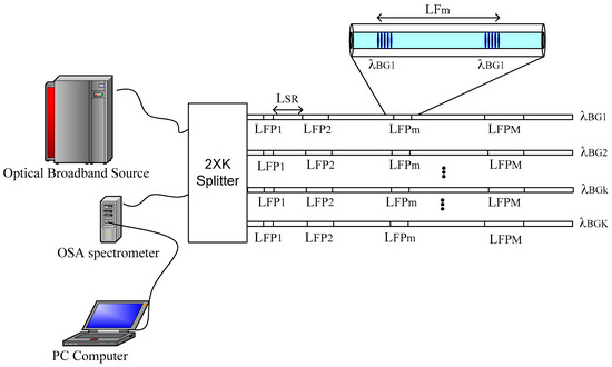 Figure 1 shows the optical system under study. The system consists of a light source, a 50/50 optical circulator, an optical spectrum analyzer (OSA spectrometer), a personal computer used for signal processing and the quasi-distributed sensor. Particularly, the quasi-distributed sensor consists of a serial arrangement of local sensors where each sensor is an interferometer formed by two identical Bragg gratings imprinted in a single-mode fiber. All Bragg gratings have low reflectivity, and their lengths are similar. Each interferometric sensor acts as a low-precision Fabry-Perot interferometer [13,16,17]. In the quasi-distributed sensor, Wavelength Division Multiplexing (WDM) and Frequency Division Multiplexing (FDM) techniques were combined. The spatial resolution eliminates ghost interferometers.