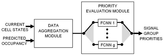 Single output of the data aggregation module can be interpreted as aggregated (weighted) occupancy of the traffic lanes that are controlled by one signal group. Such outputs are fed into the priority evaluation module, which includes one FCNN for each signal group. The number of FCNNs implemented in this module equals . Let denote the neural network assigned to signal group g. is selected to be used for evaluating the priorities of all signal groups when g is the active group, i.e., displays green signal.