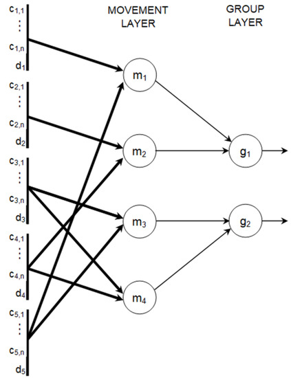 To reduce the amount of weights that have to be optimized, it was assumed that the connections between input neurons and movement neurons in the data aggregation module have the same weights: