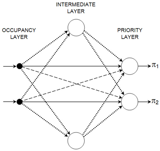 It should be noted here that the FCNN topology was selected for application in the proposed ensemble based on results of previous works, which have shown that this topology allows the number of neurons (and synaptic weights) to be reduced in comparison with the multilayer perceptron topology [23,24]. The lower number of neurons and synaptic weights is important for increasing the speed of neuroevolution. An example of the FCNN [25] for the proposed priority evaluation module is shown in Figure 4. This example concerns an intersection with two signal groups.