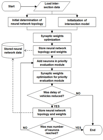 An overview of the proposed neuroevolution strategy is presented by the flow chart in Figure 5. It should be noted that this strategy can be applied independently for each signalized intersection in the road network. Output of the neuroevolution strategy includes the stored neural network topology and weights. These neural network data are used by traffic control algorithm (Algorithm 1) to evaluate priorities of signal groups.