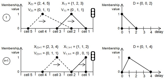 Figure 6 shows an example of the fuzzy cellular automata model representing single traffic lane with two vehicles approaching red signal at an intersection. In this example, the first vehicle has to stop in Cell 1 due to the red signal. Consequently, the second vehicle will stop in Cell 2. Traffic direction is indicated by the horizontal arrows in the left part of Figure 6. The triangular fuzzy numbers , describe location and speed of ith vehicle at time step t. The charts in right part of Figure 6 present triangular fuzzy numbers that describe total delay of the simulated vehicles. Each triangular fuzzy number F is defined by three real numbers . The components , and denote, respectively, the smallest possible value, the most possible value, and the largest possible value.