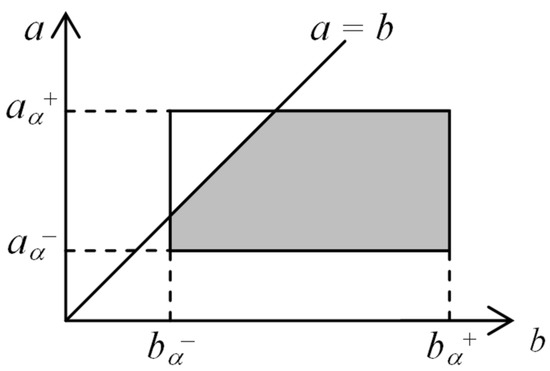 A geometrical interpretation of the definition in Equation (2) is presented in Figure 7. It should be noted that value of the numerator in Equation (2) is equal to the area of the grey region in Figure 7, which includes such combinations of and that satisfy the condition . The denominator in Equation (2) describes the area of the rectangle in Figure 7, which covers all possible combinations of and .