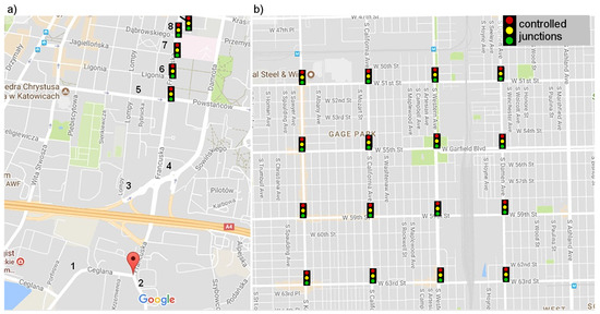 The proposed neuroevolution approach to decentralized traffic signal control was experimentally evaluated in two real-world scenarios. The first scenario takes into account a signalized artery (Francuska Street) with five intersections in the centre of Katowice, Poland. This is a one-way road with multiple inlets (Figure 8a), which often cause congestions. Each intersection has various number of lanes/geometry and thus different traffic light characteristics. In the second scenario (Figure 8b), the mesh road network of Gage Park district in Chicago was considered. Each of 16 simulated road intersections manages four-way traffic (one or two inbound and outbound lanes). To better illustrate the simulation scenarios, the intersections are presented in Figure 9. The intersections presented in Figure 9a–d are localized in Francuska Street (main traffic moves north), while intersections in Figure 9e,f are typical four-way intersections from the Gage Park district.