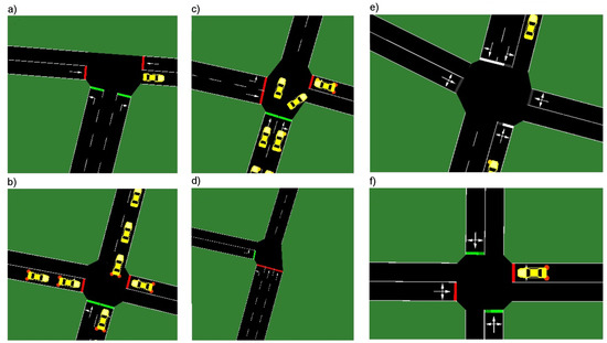 Intersections characteristic for: the first scenario (a–d); and the second scenario (e,f).