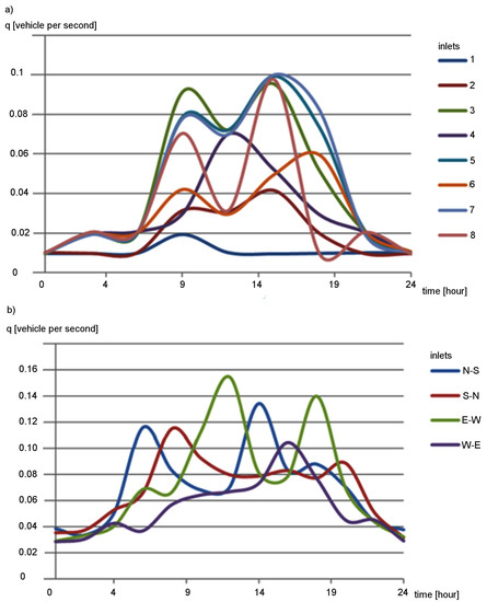 During simulations, the vehicles were randomly generated. The simulated traffic intensities were based on real-world daily traffic profiles (Figure 10) obtained from road-side sensor networks [32]. For the arterial road scenario, vehicles were inserted in inlets that are indicated in Figure 10a by numbers 1–8. The traffic intensity profiles for these inlets are shown in Figure 10a. In the case of the grid network scenario, the traffic intensity profiles, shown in Figure 10b, were assigned to particular traffic directions. For instance, the N–S profile was used to generate vehicles travelling from north to south. The vehicles were generated using the same intensity profile at each entrance of the road network for a given direction. It should also be noted that one simulation run corresponded to one day (24 h).