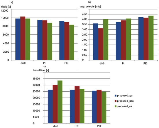 Impact of occupancy prediction on effectiveness of the proposed approach was examined in simulation experiments. Results of these experiments for the signalized arterial road scenario are presented in Figure 11. They show that the utilization of the predicted lane occupancy improves the traffic control effectiveness. When using the simple exponential smoothing method (PI), it is possible to reduce delay, decrease travel time, and increase average velocity of vehicles by 20% on average. Optimal value of the smoothing constant () was selected during preliminary experiments. An additional 10% increase in the traffic control effectiveness was achieved by using the more sophisticated prediction, which is based on k-NN algorithm (PD). Similar effects were observed for the second simulation scenario (the grid road network). Thus, the k-NN based prediction method was used to determine values in further experiments. It should be also noted that the parameters of the k-NN algorithm have been adjusted during preliminary tests to obtain the lowest vehicle delay. The suffixes _es, _ga, and _pso in the legend of Figure 11 indicate which metaheuristic algorithm was used to optimize the synaptic weights (evolutionary strategy, genetic algorithm, or particle swarm optimization, respectively).