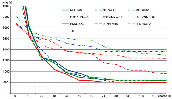 The vehicle delays in Figure 12 are average values calculated for the entire population of candidate solutions at given epoch. During this experiment, the neuroevolution was performed by using genetic algorithm to optimize the synaptic weights. Results of this research show that, due to significant number of synaptic weights, the complex ANNs with large number of neurons ( for MLP and RBF ANN, for FCNN) could not be effectively evolved in reasonable time. On the other hand, the simple ANNs with lower number of neurons could not achieve the delay level of the standard LH algorithm. Nevertheless, the MLP and FCNN provided the best results for the small ANNs. Thus, several topologies of ANNs based on MLP and FCNN were considered during the next experiments.