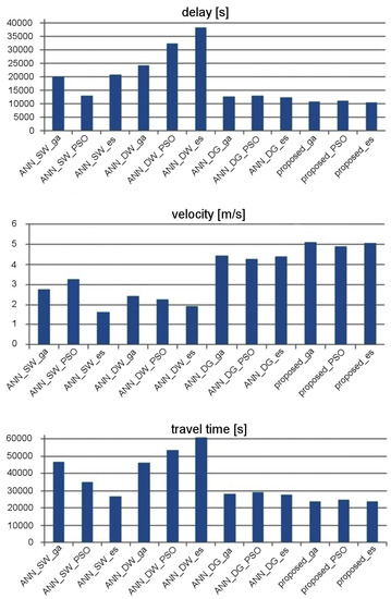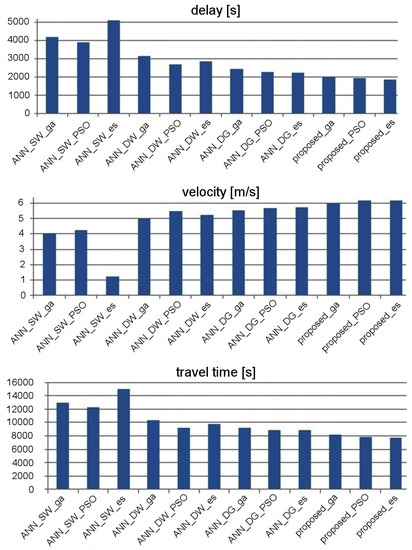 The effectiveness of traffic control was evaluated by taking into account stop delay, travel time, and average velocity of vehicles. Figure 14 and Figure 15 show the experimental results that describe effectiveness of traffic control for the considered ANN topologies. It should be kept in mind that the suffixes _es, _ga, and _pso in the labels of particular ANNs indicate which metaheuristic algorithm was used to optimize the synaptic weights. These results were averaged for 20 runs of simulation in SUMO [39]. It should be noted that the population-based metaheuristic methods, which are used in the proposed approach for synaptic weights optimization, introduce randomization of the candidate solutions at each step of the procedure (i.e., mutation in the case of the evolutionary strategy). Consequently, the final results of the metaheuristic optimization can be different after each execution of the algorithm. Therefore, the tests in SUMO were repeated 20 times to find an average result for each compared method. Based on these results, it can be observed that the effectiveness of traffic control can be improved by combining the proposed data aggregation module with standard ANN topologies. However, the best results were obtained (average speed increased by 11.2%, stop time decreased by 10.7%, and travel time decreased by 10.9% approximately to ANN_DG—second result) when using the proposed ensemble, which consists of the data aggregation module and the priority aggregation module with one FCNN for each signal group.