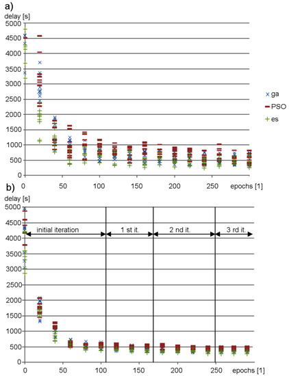 The evolution of the proposed neural network ensemble is performed in iterations, as explained in Section 3.4. After initial optimization of the synaptic weights, successive iterations were performed to adjust the topology and synaptic weights only for the priority evaluation module. Figure 16 compares results of the proposed neuroevolution approach with those obtained during optimization of the synaptic weights for ANN_DG, based on the standard metaheuristic algorithms, without iterative modifications of the neural network topology. The scatter plots in Figure 16 show vehicle delays achieved during subsequent epochs for 10 runs of the optimization procedures. It can be observed in these results that for the proposed neuroevolution strategy the obtained vehicle delay is close to the minimum in each optimization run. In the case of ANN_DG, the delay values are spread over a wide range, which means that execution of the optimization procedure can give unsatisfactory results. The proposed approach enables finding the optimal solution in shorter time. One of the reasons behind this result is the fact that in the case of the proposed FCNNs ensemble a higher effectiveness of traffic control can be obtained using a lower number of neurons in comparison to other ANN architectures. The ANN_DG needs 16 neurons on average in hidden layers to achieve good results. For the proposed method, this number is reduced by half.