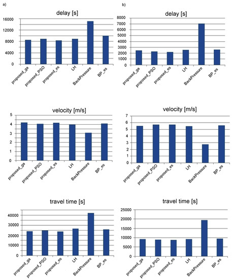 The effectiveness of the proposed neuroevolution-based traffic signal control strategy was compared with the existing decentralized traffic signal control methods from the literature. Three different state-of-the-art methods were taken into account in this study: the method LH proposed by Lammer and Helbing [7], the back-pressure algorithm [31] and the method based on self-adaptive evolutionary strategy BP_es [8]. The performance indicators, which were used for evaluation of the above mentioned methods, include vehicle delay, average speed, and travel time (Figure 17). The results shown in Figure 17 were obtained as average of 20 simulation runs for both scenarios (signalized arterial road and grid road network). Various versions of the proposed approach were taken into consideration. As explained above, the suffixes _es, _ga, and _pso indicate which metaheuristic algorithm was used to optimize the synaptic weights in a given version of the proposed method.